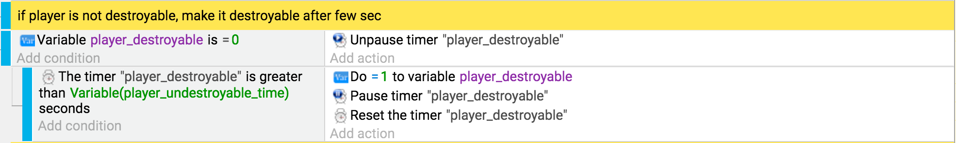 Here is a more advanced Timer example. The timer is used to briefly protect the player from damage. The amount of time given to protect the player depends on the value of the variable "player_undestroyable_time":