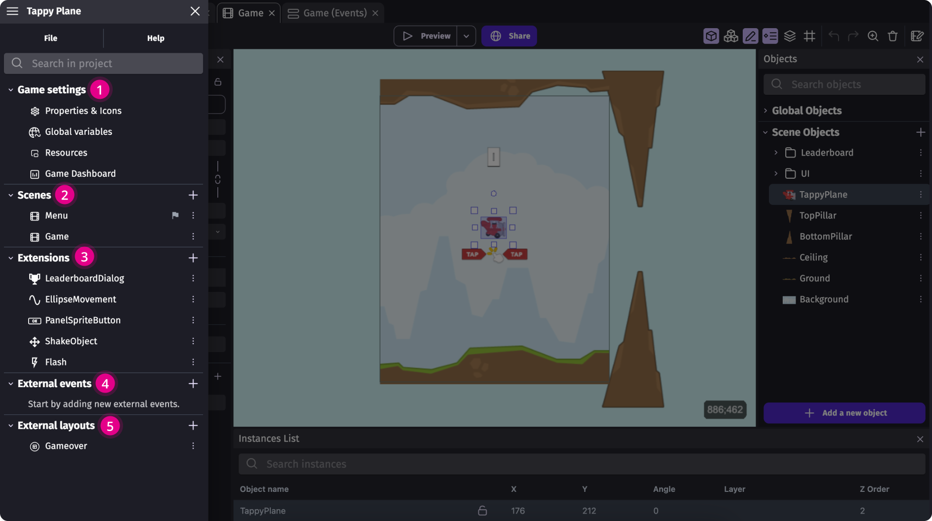 • 4. External events: External events are event sheets that are not linked to any particular scene. You can create an external event sheet and then link to it anywhere in your game's events. This allows developers to create their game logic once, and then reuse that logic throughout their project.