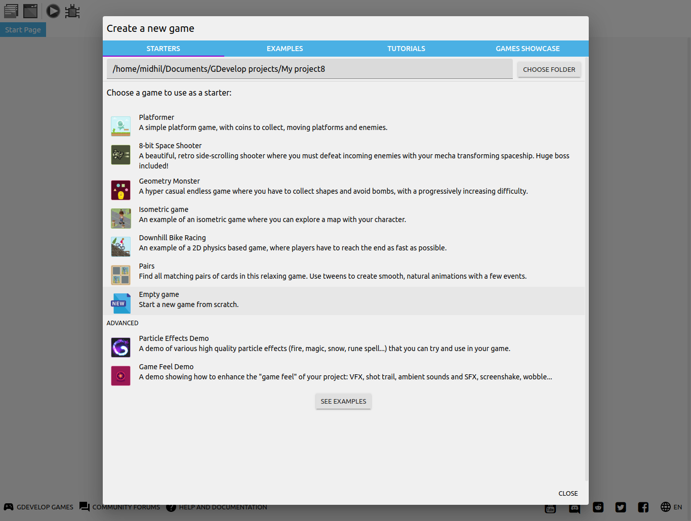 Click Create a new project on the start page. Scroll down and choose a folder for your project, then select Empty game.