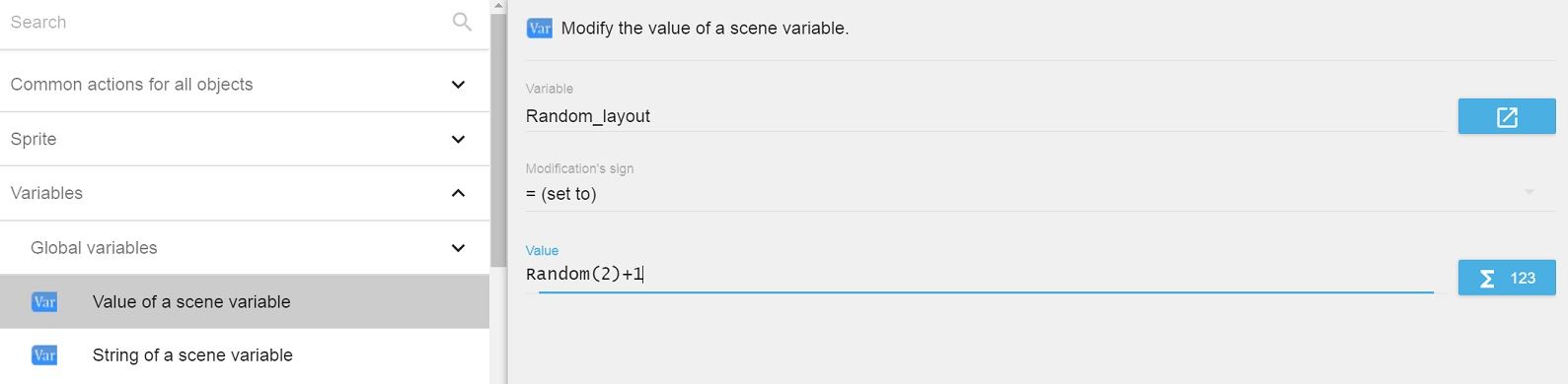 • In the Name of the external layout field, type "Layout" + ToString(Variable(Random_layout)). This will randomly add one of the external layouts to the scene.
