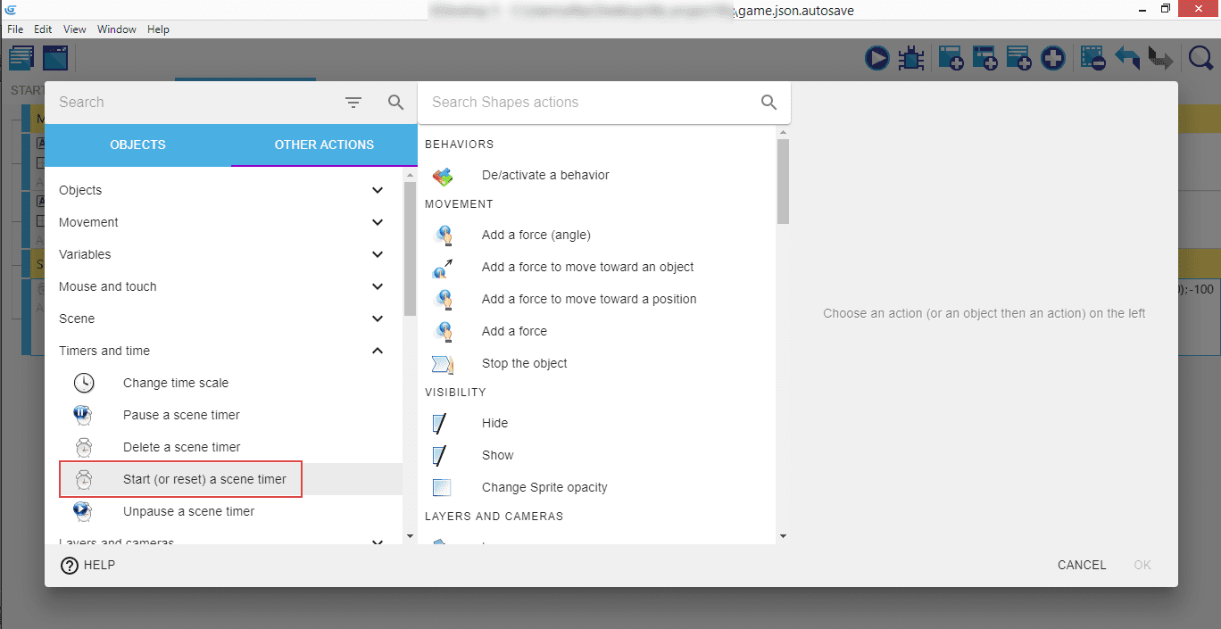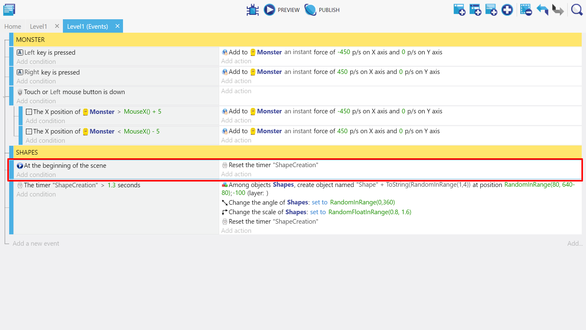 Next create a new event above the shapes event and give it the condition "at beginning of the scene", and copy/paste the earlier create "Start (or reset) a scene timer" action for "ShapeCreation" to this new event. This will start the timer at the beginning of the game in so the shapes event will trigger the first time.