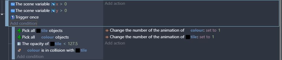 Next, create a new event then give it the condition of the left mouse button released. Then, create a sub event on the mouse button released event with the condition of pick all tile objects and the opacity of tile is \< 127.5. Finally, add an action to change tile animation to 1.