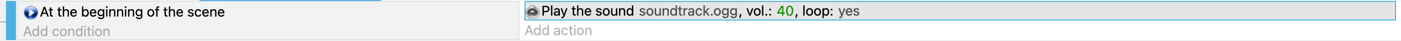 Create a new action in the previous event. Type play on the search bar, and select Play sound. Add an audio file called "soundtrack.ogg" from the assets folder. Set the volume 40, and enter 1 as the pitch value.
